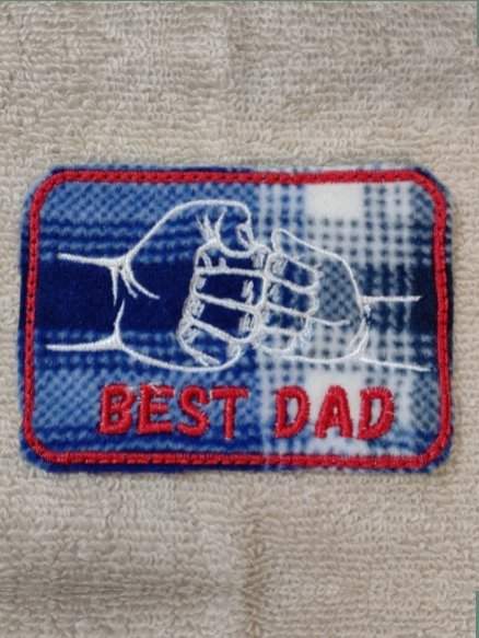 Embroidered Best Dad (Fist Bump Dad and Child) on top of Blue and White Flannel Fabric with Magnet Backing. The magnet is approximately 3.75 inches x 2.75 inches, Not Machine Washable.