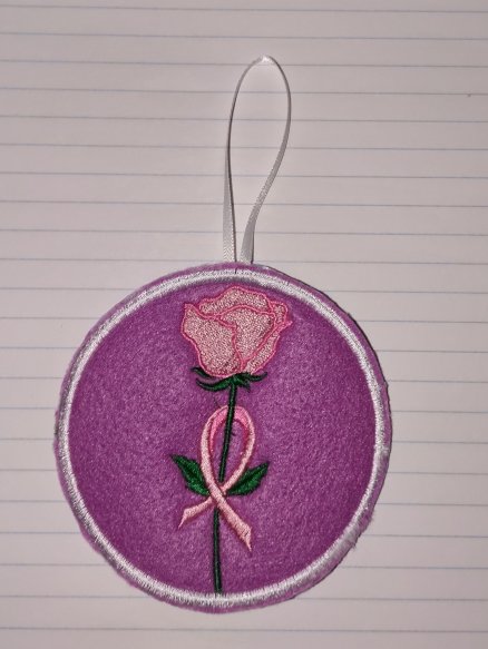 Embroidered Breast Cancer Ribbon Rose on top of Purple Felt with Ribbon Hanger. The ornament is approximately 3½ inches in diameter, Not Machine Washable.
